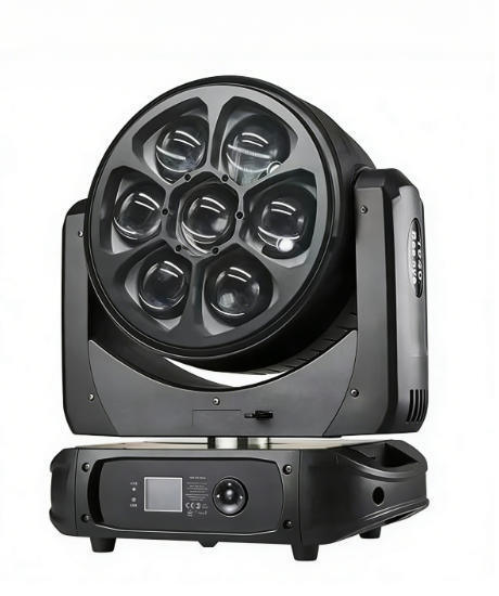 Professional-grade LED wash moving head light featuring 7 high-power RGBW LEDs with advanced zoom capabilities and comprehensive control options for stage lighting applications.